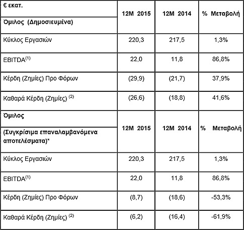 ΚΑΘΑΡΑ ΚΕΡΔΗ (ΖΗΜΙΕΣ) ΜΕΤΑ ΑΠΟ ΦΟΡΟΥΣ & ΔΙΚΑΙΩΜΑΤΑ ΜΕΙΟΨΗΦΙΑΣ: Τα ενοποιημένα αποτελέσματα μετά από φόρους από συνεχιζόμενες δραστηριότητες κατέγραψαν ζημιές €-26,6 εκ. το 2015 έναντι ζημιών €-18,8 εκ. το 2014. Οι συγκρίσιμες επαναλαμβανόμενες ενοποιημένες ζημιές μετά από φόρους παρουσιάζουν σημαντική βελτίωση κατά 61,9% διαμορφώνοντας τις ζημιές σε €-6,2 εκ. το 2015 έναντι ζημιών €-16,4 εκ. το 2014.
