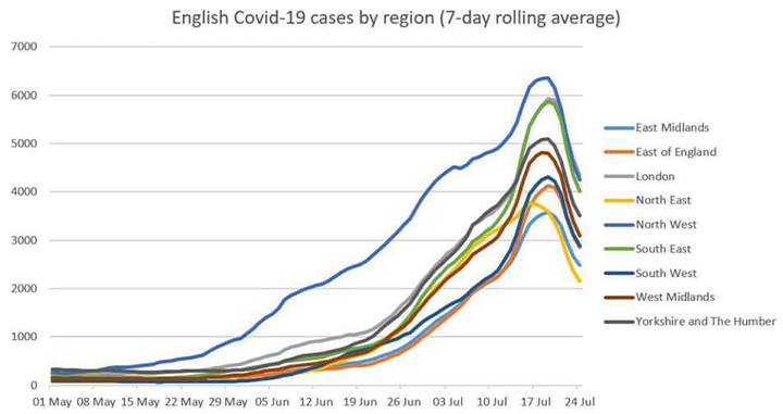 Επικαλούμενος την περίπτωση της Αγγλίας, ο καθηγητής υπογραμμίζει πως παρατηρείται αποκλιμάκωση της πανδημίας σε όλες τις περιοχές της χώρας (γράφημα). Όπως αναφέρει, το 90% των ενηλίκων στην Αγγλία έχουν αντισώματα, είτε γιατί έχουν νοσήσει είτε γιατί έχουν εμβολιαστεί. Στο ερώτημα πότε θα αποκτήσουμε και στη χώρα μας παρόμοια ανοσία, απαντά: