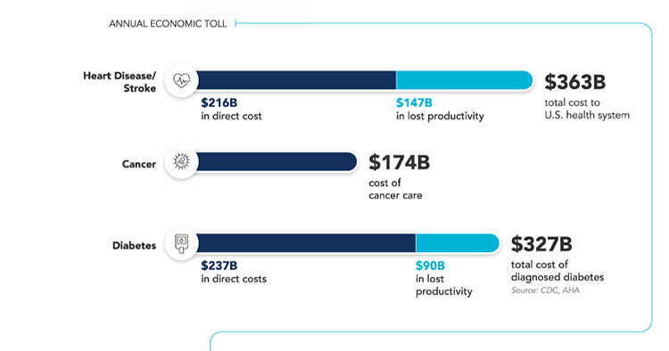 Για παράδειγμα, οι καρδιοπάθειες και τα εγκεφαλικά επεισόδια προκάλεσαν πέρσι 868.662 θανάτους Αμερικανών. Το συνολικό κόστος ανήλθε στα 363 δισ. δολ. για το σύστημα υγείας των ΗΠΑ (216 δισ. δολ το άμεσο κόστος και 147 δισ. δολ. σε χαμένη παραγωγικότητα).