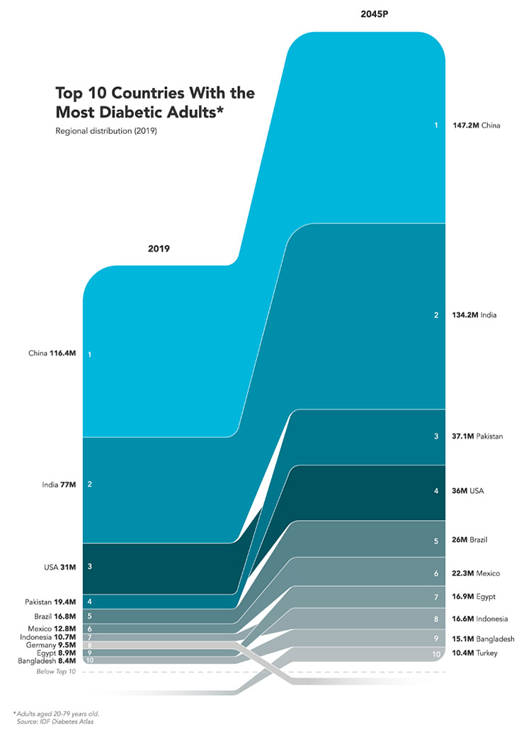 Ποιες χώρες διατρέχουν τον μεγαλύτερο κίνδυνο να έχουν τους περισσότερους διαβητικούς ενήλικες (ηλικίας 20-79 ετών) τώρα και στο μέλλον; Πρώτη είναι η Κίνα, με εκτίμηση οι ασθενείς να φθάνουν τα 147 εκατ. το 2045, ενώ ακολουθούν η Ινδία με 134.2 , το Πακιστάν με 37.1, η Αμερική με 36.0, η Βραζιλία με 26.0, το Μεξικό με 22.3, η Αίγυπτος με 16.9, η Ινδονησία με 16.6, το Μπαγκλαντές με 15.1 και η Τουρκία με 10.4 εκατ. ασθενείς.