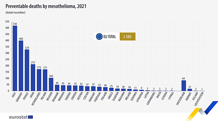 Η Ιταλία ανέφερε τον υψηλότερο αριθμό θανάτων από μεσοθηλίωμα που μπορούσαν να προληφθούν το 2021 (518), ακολουθούμενη από τη Γερμανία (400) και τη Γαλλία (329).