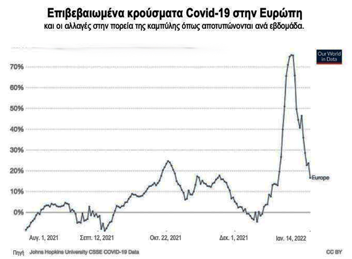 "Ο εβδομαδιαίος ρυθμός μεταβολής των επιβεβαιωμένων κρουσμάτων για οποιαδήποτε δεδομένη ημερομηνία, αποτυπώνει την ποσοστιαία αλλαγή στον αριθμό των επιβεβαιωμένων κρουσμάτων, τις τελευταίες 7 ημέρες σε σχέση με τον αριθμό των προηγούμενων 7 ημερών. Από το γράφημα βλέπουμε πως ο ρυθμός μεταβολής των επιβεβαιωμένων κρουσμάτων Covid-19 στην Ευρώπη συνεχίζει να μειώνεται.