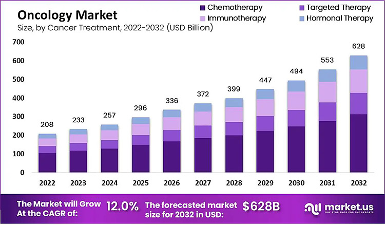 Σύμφωνα με την εταιρεία ερευνών Market.us, κινητήρια δύναμη για την ανάπτυξη της παγκόσμιας ογκολογικής αγοράς είναι ο αυξανόμενος επιπολασμός της ασθένειας, η οποία με τη σειρά της αυξάνει την ζήτηση για καινοτόμες και αποτελεσματικές θεραπείες. Ο καρκίνος, είναι η τρίτη πιο καταστροφική ασθένεια παγκοσμίως μετά τα καρδιαγγειακά, τα λοιμώδη νοσήματα και τα παρασιτικά. Εκτιμάται ότι το μέγεθος της παγκόσμιας ογκολογικής αγοράς από 208 δισ. δολ. που ήταν το 2022 θα φτάσει τα 628 δισ. δολ. μέχρι το τέλος του 2032, σημειώνοντας άνοδο 12%.