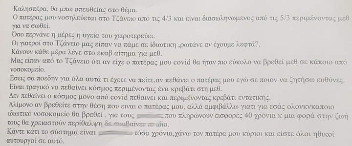 Χαρακτηριστική είναι η επιστολή πολίτη, του οποίο ο πατέρας έχει διασωληνωθεί στο "Τζάνειο" από τις 5 Μαρτίου και περιμένει να βρεθεί ΜΕΘ. Η επιστολή απευθύνεται στην Ομοσπονδία εργαζομένων στα νοσοκομεία (ΠΟΕΔΗΝ) και παρατίθεται πιο κάτω.