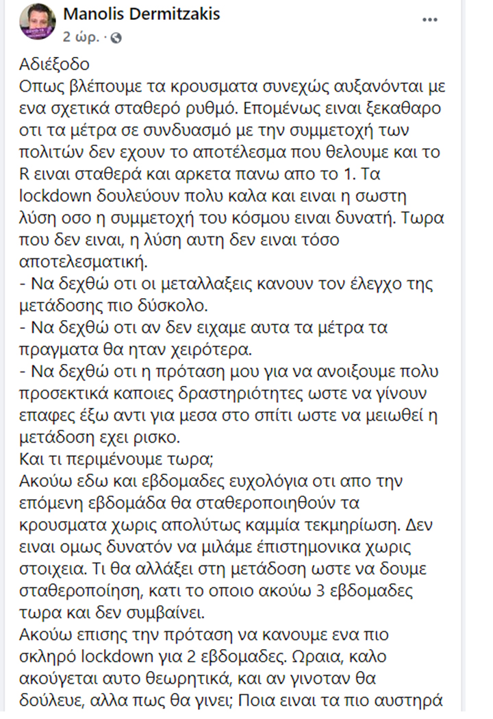 "Αδιέξοδο. Όπως βλέπουμε, τα κρούσματα συνεχώς αυξανόνται με έναν σχετικά σταθερό ρυθμό. Επομένως, είναι ξεκάθαρο ότι τα μέτρα, σε συνδυασμό με τη συμμετοχή των πολιτών, δεν έχουν το αποτέλεσμα που θέλουμε και το R (σ.σ. ο δείκτης μετάδοσης) είναι σταθερά και αρκετά πάνω απο το 1. Τα lockdown δουλεύουν πολύ καλά και είναι η σωστή λύση, όσο η συμμετοχή του κόσμου είναι δυνατή. Τώρα που δεν είναι, η λύση αυτή δεν είναι τόσο αποτελεσματική.