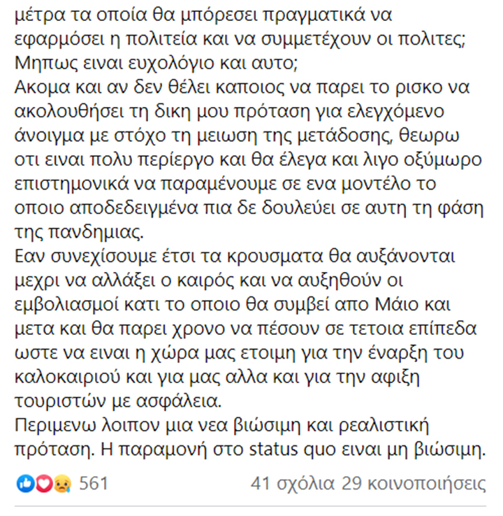 Ακόμα και αν δεν θέλει κάποιος να πάρει το ρίσκο να ακολουθήσει τη δική μου πρόταση, για ελεγχόμενο άνοιγμα, με στόχο τη μείωση της μετάδοσης, θεωρώ ότι είναι πολύ περίεργο και θα έλεγα και λίγο οξύμωρο επιστημονικά να παραμένουμε σε ενα μοντέλο, το οποίο αποδεδειγμένα πια δεν δουλεύει σε αυτή τη φάση της πανδημίας.