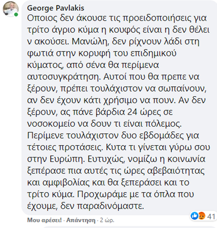 "Όποιος δεν άκουσε τις προειδοποιήσεις για τρίτο άγριο κύμα, ή κουφός είναι ή δεν θέλει ν ακούσει. Μανώλη, δεν ρίχνουν λάδι στη φωτιά στην κορυφή του επιδημικού κύματος.