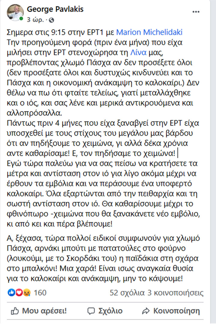 "Την προηγούμενη φορά (πριν ένα μήνα) που είχα μιλήσει στην ΕΡΤ στενοχώρησα τη Λίνα μας (σ.σ. Λίνα Παπαδάκη, δημοσιογράφος), προβλέποντας χλωμό Πάσχα αν δεν προσέξετε όλοι (δεν προσέξατε όλοι και δυστυχώς κινδυνεύει και το Πάσχα και η οικονομική ανάκαμψη το καλοκαίρι).