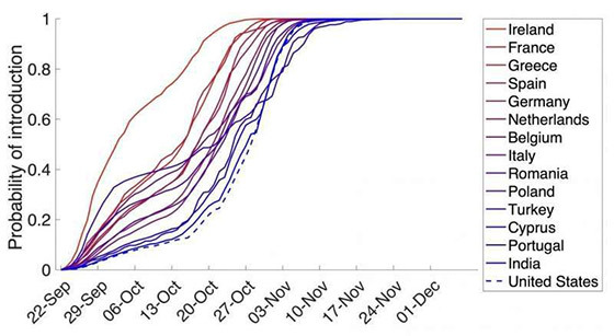 Αναλύοντας στοιχεία από 15 χώρες, ερευνητές υπολόγισαν την πιθανότητα, ταξιδιώτες από τη Βρετανία να εισήγαγαν την παραλλαγή σε 15 χώρες μεταξύ Σεπτεμβρίου-Δεκεμβρίου 2020.
