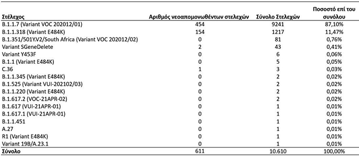 Εκ των 454 δειγμάτων με στελέχη ειδικού ενδιαφέροντος, όλα αφορούν το βρετανικό στέλεχος Β.1.1.7/UK lineage (Variant VOC 202012/01), ενώ τα 154 δείγματα με στελέχη VUI αφορούν το νοτιοαφρικανικό B.1.1.318 (Variant E484K).
