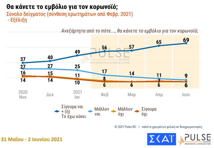 Επτά στους δέκα δηλώνουν πως θα κάνουν το εμβόλιο, ανεξάρτητα από το πότε (69% στην τελευταία δημοσκόπηση, έναντι 65% στην προηγούμενη). Το 9% δηλώνουν πως "μάλλον θα το κάνουν" (11% στην προηγούμενη μέτρηση), ενώ το 6% απαντούν αρνητικά (αμετάβλητο ποσοστό).