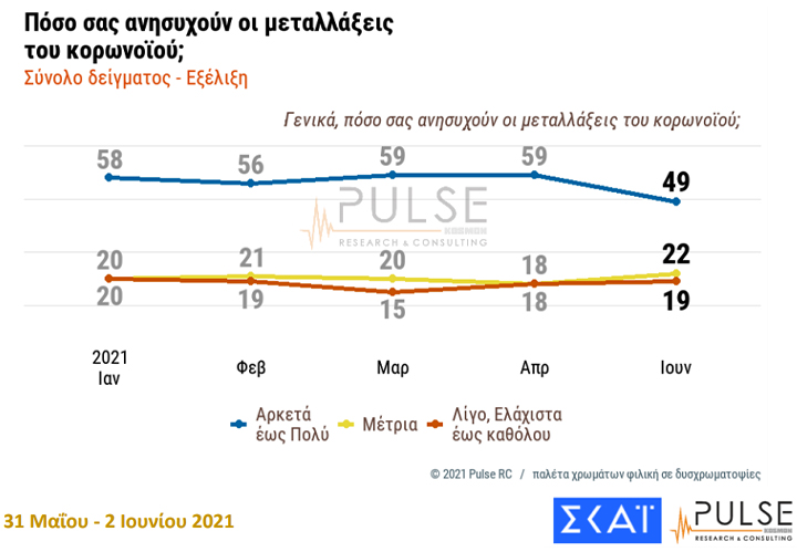 Όπως προκύπτει από το ακόλουθο γράφημα, το ποσοστό των συμμετεχόντων που δηλώνουν πως ανησυχούν αρκετά έως πολύ για τις μεταλλάξεις του κορωνοϊού, υποχώρησε στο 49%, έναντι 59% στην προηγούμενη μέτρηση.