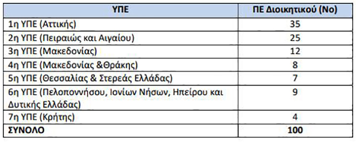 Γεωγραφική κατανομή 100 στελεχών ΠΕ διοικητικού ανά Υγειονομική Περιφέρεια