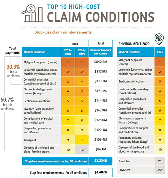 Η έκθεση διαπίστωσε ότι το 2020, ο καρκίνος ήταν η πιο συνηθισμένη και πιο δαπανηρή ιατρική πάθηση, με αύξηση 16%. Τα φάρμακα για τον καρκίνο αντιστοιχούσαν στα 9 από το 10 πιο δαπανηρά φάρμακα υψηλού κόστους το 2020.