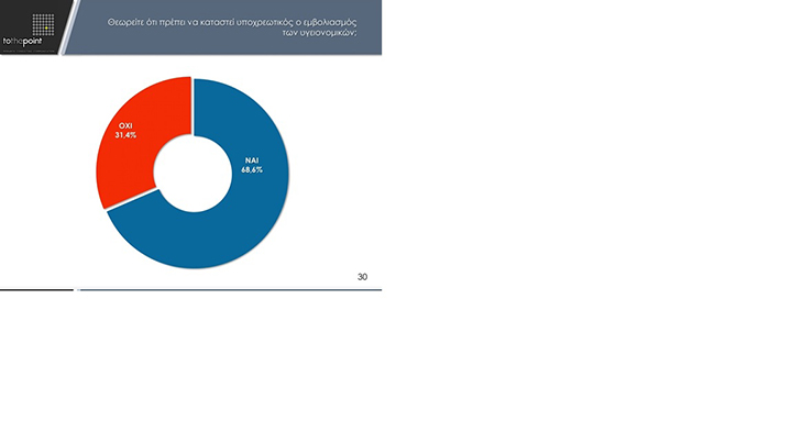 Στην έρευνα, που πραγματοποιήθηκε από την εταιρεία "Τo The Point" σε σταθμισμένο δείγμα 1.128 πολιτών σε ολόκληρη την Π.Ε. Θεσσαλονίκης, καταγράφεται, επίσης, υψηλό ποσοστό συμφωνίας των πολιτών στην αναγκαιότητα του μέτρου του υποχρεωτικού εμβολιασμού των υγειονομικών. Το 68,6% των ερωτηθέντων απάντησαν καταφατικά στη συγκεκριμένη ερώτηση, ενώ ανάλογο ήταν και το ποσοστό των γιατρών - μελών του Συλλόγου σε παράλληλη έρευνα, σε 606 γιατρούς όλων των ειδικοτήτων.