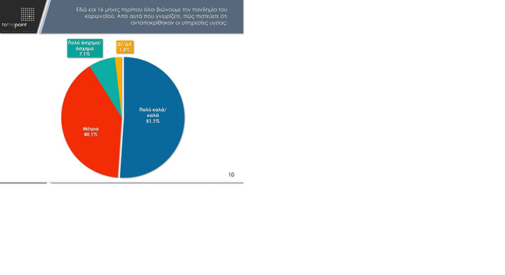 Σύμφωνα με την έρευνα, ένα ποσοστό 51,1% των ερωτηθέντων δείχνει εμπιστοσύνη στην ανταπόκριση των υπηρεσιών Υγείας τα τελευταία δύο έτη, και ειδικά στους 16 μήνες της πανδημίας.