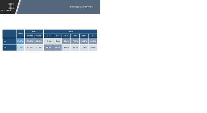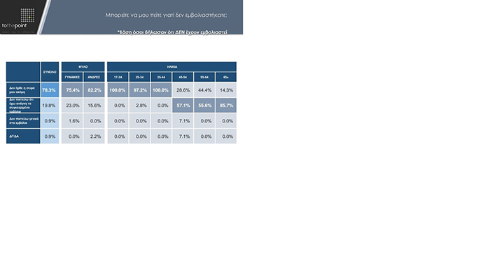 Ανησυχητικό είναι το ποσοστό 85,7% όσων δεν έκαναν το εμβόλιο από την κατηγορία 65+, οι οποίοι δεν πιστεύουν ότι έχουν ανάγκη το εμβόλιο.