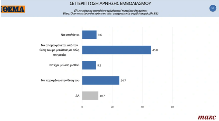 Σε περίπτωση άρνησης εμβολισμού, το 45,8% των συμμετεχόντων θεωρούν πως πρέπει να απομακρύνεται από τη θέση του, με μετάθεση σε άλλη υπηρεσία.