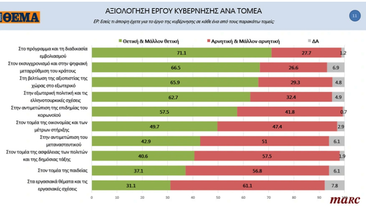 Το 71,1% αξιολογούν θετικά ή μάλλον θετικά την κυβέρνηση στο πρόγραμμα και στη διαδικασία εμβολιασμού, το 27,7% αρνητικά ή μάλλον αρνητικά και το 1,2% δεν απαντούν.