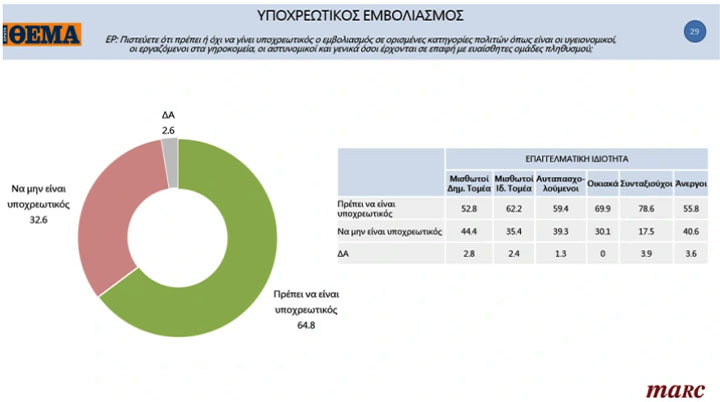 Το υψηλότερο ποσοστό όσων δεν θέλουν να είναι υποχρεωτικός είναι δημόσιοι υπάλληλοι (44,4%) και το χαμηλότερο συνταξιούχοι (17,5%).