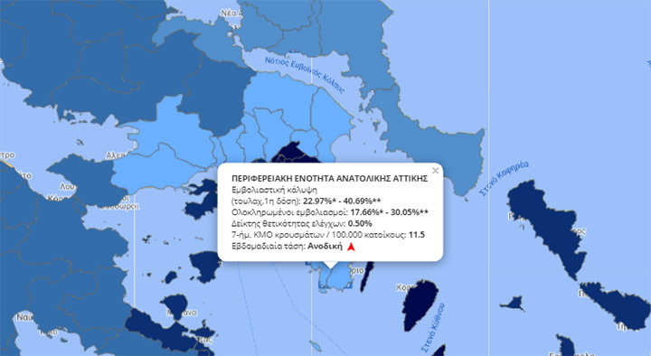 Σε περιοχές όπως της Αττικής οι αποκλίσεις είναι πολύ μεγαλύτερες. Για παράδειγμα η Ανατολική Αττική εμφανίζεται να έχει κάλυψη 1ης δόσης 22,97% με βάση το εμβολιαστικό κέντρο και 40,69% με βάση τους διαμένοντες κατοίκους, ενώ στους ολοκληρωμένους εμβολιασμούς τα αντίστοιχα ποσοστά είναι 17,66% και 30,05%.
