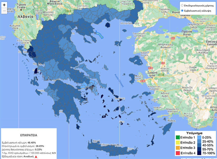 Εδώ και λίγες μέρες ο διαδραστικός χάρτης έχει προσαρμοστεί και σε αυτό το δεδομένο και καταγράφει δύο διαφορετικούς αριθμούς σε ό,τι αφορά την εμβολιαστική κάλυψη της κάθε περιοχής: Ο πρώτος αριθμός, σημασμένος με ένα αστεράκι (*), αναφέρεται στην εμβολιαστική κάλυψη, όπως προκύπτει από την τοποθεσία κάθε εμβολιαστικού κέντρου, που όπως διευκρινίζεται μπορεί να περιλαμβάνει εργαζόμενους, μη μόνιμους κατοίκους της Περιφερειακής Ενότητας. Ο δεύτερος αριθμός, με δύο αστεράκια (**) εμφανίζει την κάλυψη όπως προκύπτει από την διαθέσιμη πληροφορία διαμενόντων εντός της Περιφερειακής Ενότητας.