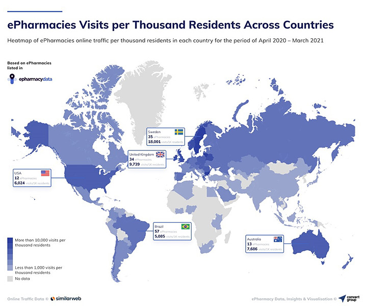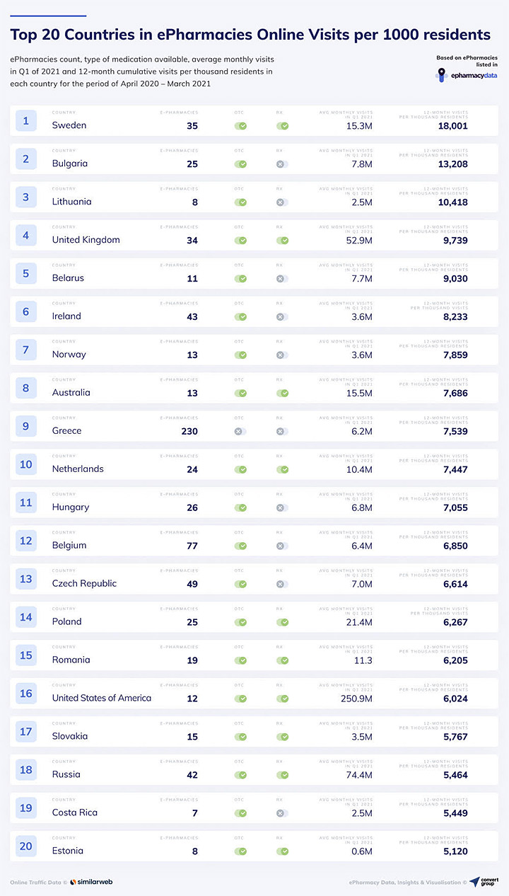 -Η Σουηδία ήταν η κορυφαία χώρα με 18,001 επισκέψεις σε διαδικτυακά φαρμακεία ανά 1.000 κατοίκους, ακολουθούμενη από 13.208 επισκέψεις ανά 1.000 κατοίκους στη Βουλγαρία, 10.418 επισκέψεις ανά 1.000 κατοίκους στη Λιθουανία και 9.739 επισκέψεις ανά 1.000 κατοίκους στο Ηνωμένο Βασίλειο.