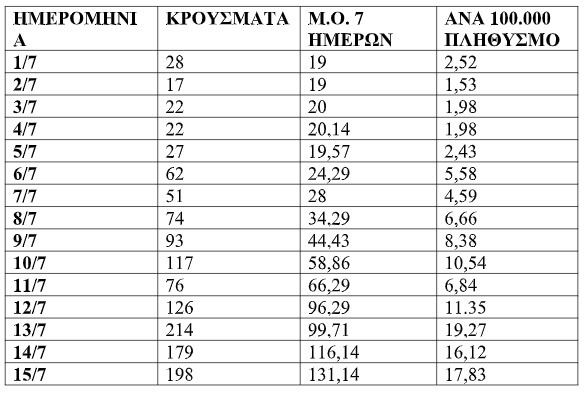 Όπως αποτυπώνεται και στον παρακάτω πίνακα, τα κρούσματα αυξήθηκαν κατά 7 φορές, φτάνοντας από τα 27 στις 5 Ιουλίου στα 198 στις 15 του μηνός. Αντίστοιχη εκτίναξη καταγράφηκε στον μέσο όρο κρουσμάτων 7 ημερών, που από 20 έφτασαν τα 131, καθώς και στα κρούσματα ανά 100.000 πληθυσμό, τα οποία βρίσκονται στα 16, από μόλις 2,5 πριν από δέκα μέρες.
