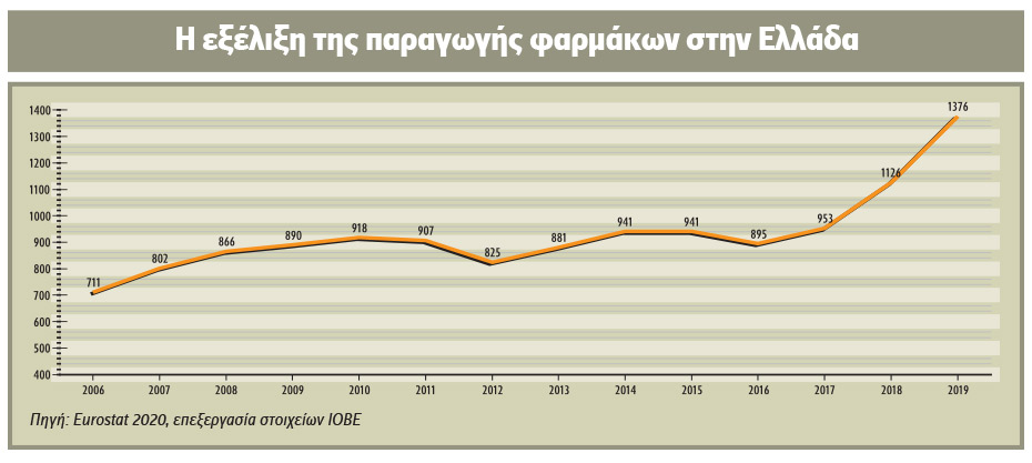 Παράλληλα, σημαντική ήταν και η αξία παραγωγής φαρμάκων, που άγγιξε το 1,4 δισ. ευρώ το 2019, ενώ αντιστοιχεί στο 8,5% των συνολικών εξαγωγών των μεταποιητικών προϊόντων (πλην πετρελαίου). Σημειώνεται ότι ο κλάδος πραγματοποιεί εξαγωγές σε 148 χώρες (το 66% κατευθύνεται σε Γαλλία, Γερμανία, Ηνωμένο Βασίλειο, Ισπανία, Ιταλία, Κύπρο), φτάνοντας σε αξία, το 2019, το 1,7 δισ. ευρώ.