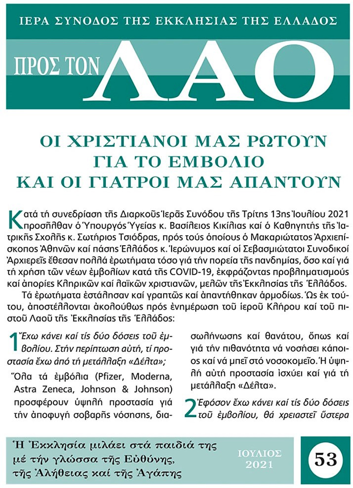 Έξι μήνες μετά, έπειτα από αίτημα της κυβέρνησης προς τον Αρχιεπίσκοπο Αθηνών και Πάσης Ελλάδος, κ. Ιερώνυμο και τους συνοδικούς αρχιερείς, η Εκκλησία πήρε πιο ξεκάθαρη στάση, θέλοντας να συμβάλλει με τον τρόπο της στην ενίσχυση των ποσοστών εμβολιαστικής κάλυψης του πληθυσμού.