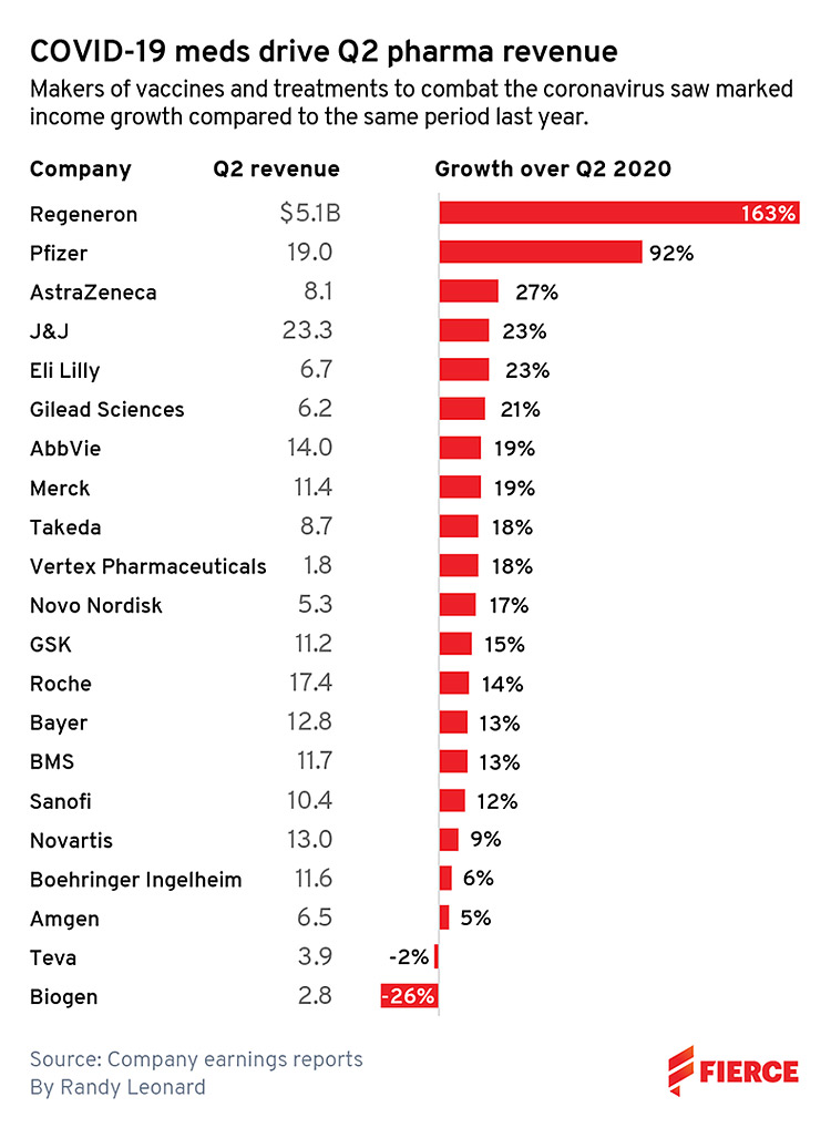 Όπως ήταν αναμενόμενο, οι εταιρείες που κατέγραψαν τη μεγαλύτερη αύξηση εσόδων ήταν αυτές που ανέπτυξαν θεραπείες για την COVID-19. Στην πραγματικότητα, αυτό ίσχυε και για τις έξι επιχειρήσεις που ξεπέρασαν την αύξηση του 20%, συμπεριλαμβανομένης της Regeneron (αύξηση 163%) με 2,59 δισ. δολ. σε πωλήσεις για το φάρμακο αντισωμάτων REGEN-COV και της Pfizer (92%) με 7,8 δισ. δολ. σε πωλήσεις από τον εμβόλιό της για τον κορωνοϊό.