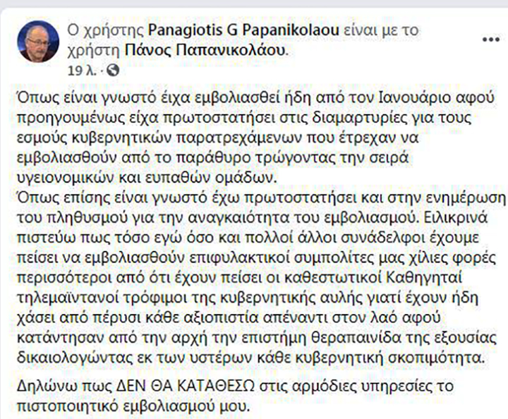 Με ανάρτησή του στο Facebook, ο κ. Παπανικολάου, που είχε εμβολιαστεί τον περασμένο Ιανουάριο, εξηγεί τους λόγους για τους οποίους προχωρεί στη συγκεκριμένη ενέργεια: