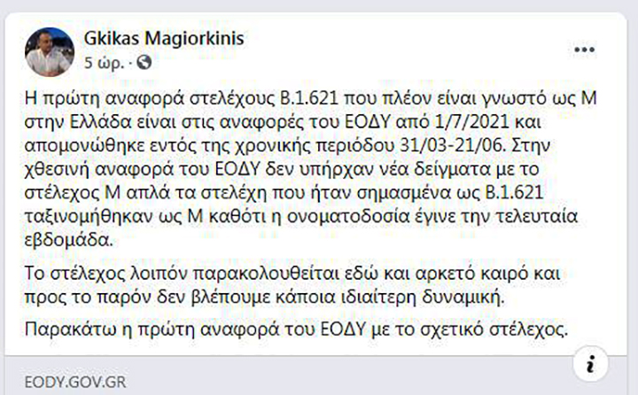 "Η πρώτη αναφορά στελέχους Β.1.621 που πλέον είναι γνωστό ως M στην Ελλάδα είναι στις αναφορές του ΕΟΔΥ από 1/7/2021 και απομονώθηκε εντός της χρονικής περιόδου 31/03-21/06. Στην χθεσινή αναφορά του ΕΟΔΥ δεν υπήρχαν νέα δείγματα με το στέλεχος Μ απλά τα στελέχη που ήταν σημασμένα ως B.1.621 ταξινομήθηκαν ως Μ καθότι η ονοματοδοσία έγινε την τελευταία εβδομάδα.
