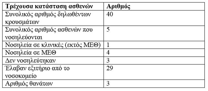 Σε ό,τι αφορά την κατάσταση των 40 ατόμων που έχουν προσβληθεί επιβεβαιωμένα κατά την τρέχουσα περίοδο, 5 ασθενείς νοσηλεύονται, οι 4 εκ των οποίων σε ΜΕΘ, ενώ άλλοι 29 έχουν λάβει εξιτήριο.