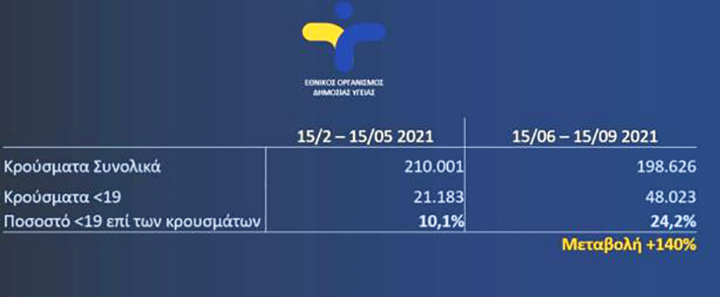 Αντίστοιχα, το ποσοστό των συνολικών κρουσμάτων COVID-19 που αντιστοιχούσε σε νέους κάτω των 19 ετών αυξήθηκε από 10.1% (15/02/21-15/5/21) σε 24.2% (15/06/21-15/9/21).