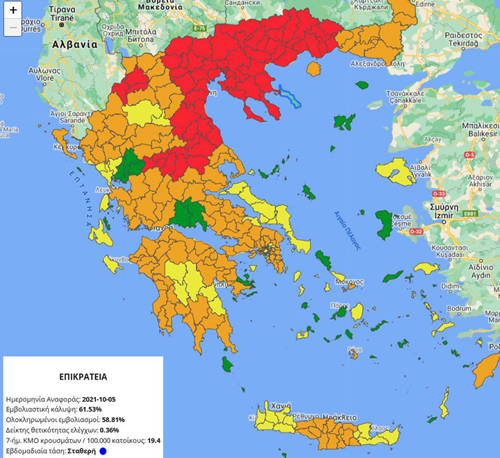 "Κοκκίνησαν" στον επιδημιολογικό χάρτη οι Σέρρες (φωτογραφία) και η Καρδίτσα. Πλέον, σχεδόν όλη η βόρεια Ελλάδα βρίσκεται στην ίδια δύσκολη θέση.
