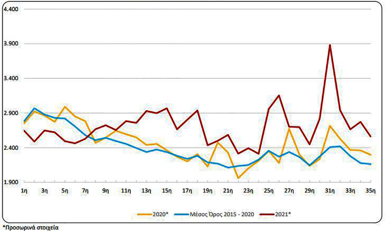 Θάνατοι για τις εβδομάδες 1 - 35 για τα έτη 2020 και 2021 και μέσος όρος θανάτων 2015 - 2020