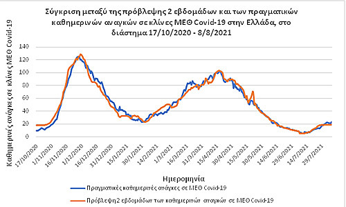 Σχήμα 1. Σύγκριση των προβλέψεων των καθημερινών αναγκών σε κλίνες ΜΕΘCovid-19 με τα πραγματικά επιδημιολογικά στοιχεία που δόθηκαν δημοσίως μέσα σε διάστημα 10 μηνών (17/10/2020 με 8/8/2021), περιλαμβανομένων και των δύο μεγάλων κυμάτων της πανδημίας.