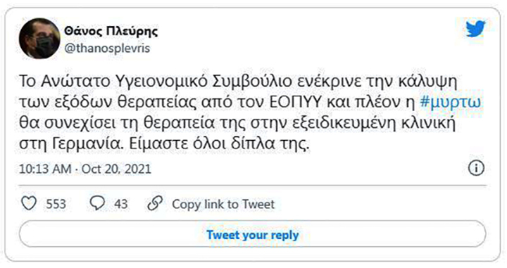 Όπως ανακοίνωσε ο υπουργός Υγείας Θάνος Πλεύρης, το Ανώτατο Υγειονομικό Συμβούλιο ενέκρινε την κάλυψη των εξόδων θεραπείας από τον ΕΟΠΥΥ. Η Μυρτώ θα συνεχίσει πλέον τη θεραπεία της σε εξειδικευμένη κλινική στη Γερμανία.
