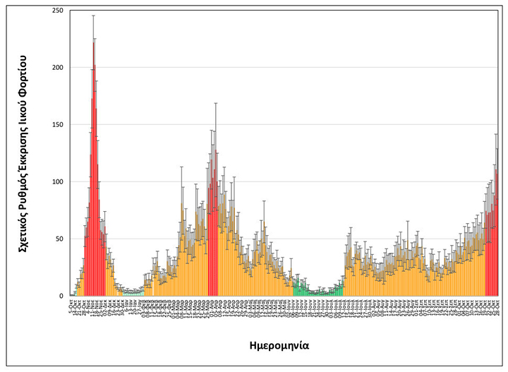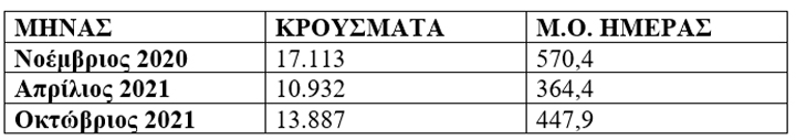 Στον παρακάτω πίνακα παρατίθενται τα μεγέθη του Οκτωβρίου του 2021, που ολοκληρώθηκε χθες, σε σύγκριση με τον Νοέμβριο του 2020 και τον Απρίλιο του 2021, μήνες κορύφωσης του 2ου και 3ου κύματος της πανδημίας, αντίστοιχα.