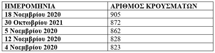 Ο παρακάτω πίνακας αποτυπώνει τις 5 ημερομηνίες με τα περισσότερα καταγεγραμμένα κρούσματα από την έναρξη της πανδημίας στη Θεσσαλονίκη. Οι 4 στις 5 ήταν μέσα στον Νοέμβριο του 2020.
