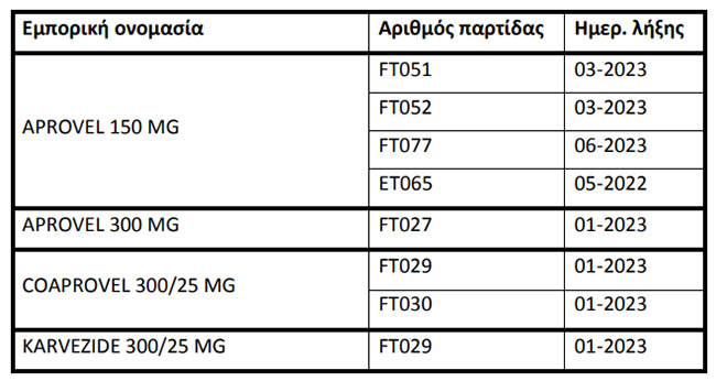 Ο ΕΟΦ αποφάσισε την ανάκληση των παρτίδων του Πίνακα Ι των φαρμακευτικών προϊόντων Aprovel 150mg, Aprovel 300mg, CoAprovel 300/25mg και Karvezide 300/25mg, λόγω υπέρβασης του ορίου LTL (33ppm) για την ουσία GTI 2 (5-(4΄-(azidomethyl)-[1,1΄-biphenyl]-2yl)-1H-tetrazole.