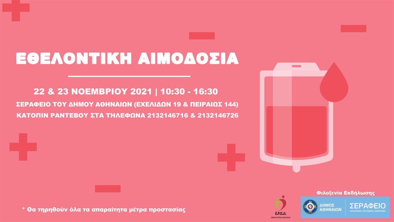 Για τους λόγους αυτούς, προσκαλούμε νέους και παλιούς εθελοντές αιμοδότες να ανταποκριθούν στις ανάγκες αυτής της δύσκολης περιόδου και να προσέλθουν στην εθελοντική αιμοδοσία που θα πραγματοποιηθεί τη Δευτέρα 22 και την Τρίτη 23 Νοεμβρίου, στο Σεράφειο του Δήμου Αθηναίων (Εχελιδών 19 και Πειραιώς 144 - www.serafio.gr) με ωράριο 10.30 έως 16.30.