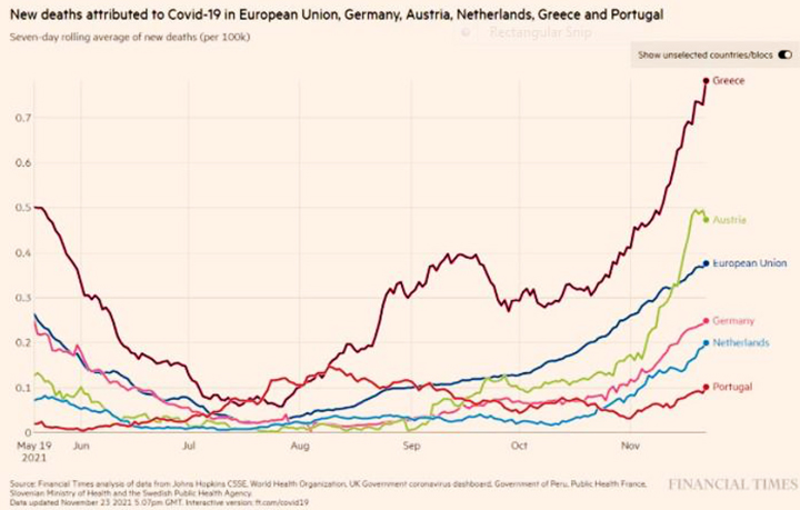 Παρουσίασε δε, διάγραμμα που δημοσιεύουν σήμερα οι Financial Times, σύμφωνα με το οποίο η Ελλάδα, σε αριθμό θανάτων και κρουσμάτων, είναι πολύ πιο πάνω από την Αυστρία και πολύ πιο πάνω από το μέσο όρο της ΕΕ.