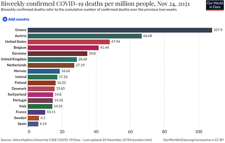 Ακόμη πιο ζοφερή είναι η εικόνα σε ό,τι αφορά τους θανάτους του τελευταίου δεκαπενθημέρου και τον ρυθμό αύξησής τους, που είναι σχεδόν διπλάσιος από τη δεύτερη της λίστας, Αυστρία. Ο καθηγητής ονόμασε τις τιμές χιλιόμετρα ανά ώρα για να δείξει με παραστατικό τρόπο την ταχύτητα με την οποία, όπως λέει, τρέχει η κάθε χώρα προς τον γκρεμό.