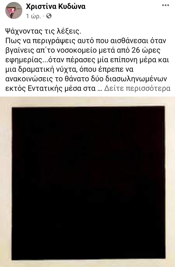 Σε μια συγκλονιστική της ανάρτηση, που φέρει τον τίτλο "Ψάχνοντας τις λέξεις" και συνοδεύεται με τον πίνακα "Το Μαύρο Τετράγωνο" του Μάλεβιτς, η κ. Κυδώνα περιγράφει αυτό και άλλα γεγονότα της 26ωρης εφημερίας και μιλά για την σωματική και συναισθηματική εξουθένωση των υγειονομικών που κλήθηκαν για πολλοστή φορά να διαχειριστούν δραματικές καταστάσεις.