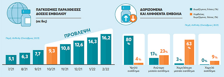 Σύμφωνα με στοιχεία που παρουσιάστηκαν από την Ευρωπαϊκή Ομοσπονδία Φαρμακευτικών Επιχειρήσεων και Συνδέσμων (EFPIA) και τον Σύνδεσμο Φαρμακευτικών Επιχειρήσεων Ελλάδος (ΣΦΕΕ), μέσα σε δύο μήνες (Δεκέμβριος 2021), η παγκόσμια παραγωγή εμβολίων COVID-19 θα ξεπεράσει τα 12 δισ. Η τρέχουσα παραγωγή κυμαίνεται στις 1.2 δισ. δόσεις τον μήνα. Η επιτυχία στη μάχη κατά της CοVιD-19, ωστόσο, βασίζεται στη διανομή και τη χορήγηση αυτών των δόσεων παγκοσμίως. Η βιομηχανία έχει δεσμευτεί να παρέχει όσο το δυνατόν μεγαλύτερη στήριξη. Μέχρι την 1η Οκτώβρη του 2021, 558 εκατ. δωριζόμενες δόσεις έλαβαν χώρες που τις χρειαζόντουσαν.