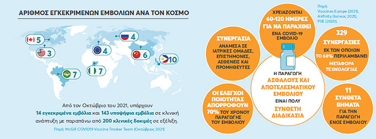 Σύμφωνα με τα διαθέσιμα στοιχεία υπάρχουν 14 εγκεκριμένα εμβόλια και 143 υποψήφια εμβόλια σε κλινική ανάπτυξη με παραπάνω από 200 κλινικές δοκιμές σε εξέλιξη. Στο σημείο αυτό, αξίζει να επισημανθεί ότι το 70% του χρόνου παραγωγής ενός εμβολίου απορροφάται από τον ποιοτικό έλεγχο και τις κλινικές δοκιμές. Το να γνωρίζουμε τα συστατικά ενός εμβολίου και τον τρόπο συνδυασμού τους δεν είναι επαρκές: η εμπειρογνωμοσύνη και η εμπειρία έχουν σημασία, γι’αυτό και είναι καθοριστικές οι 329 συμφωνίες εθελοντικής συνεργασίας που βρίσκονται σε εξέλιξη. Παράλληλα, απαιτούνται 11 σύνθετα βήματα για την παραγωγή ενός εμβολίου, ενώ χρειάζονται από 60 έως και 120 ημέρες για την παραγωγή ενός εμβολίου κατά του Κορωνοϊού.