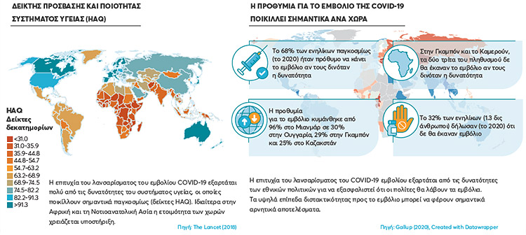 Οπως υποστηρίζεται, οι δυνατότητες απορρόφησης των συστημάτων υγείας και η διστακτικότητα προς το εμβόλιο είναι εμπόδια στην προσβασιμότητα και την επιτυχία του εμβολίου.