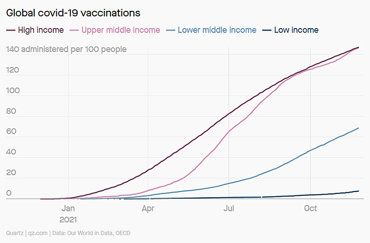 Αν και δεν είναι ακόμη σαφές, εάν τα εμβόλια θα αποδειχθούν εξίσου αποτελεσματικά στην προστασία των ανθρώπων από σοβαρές περιπτώσεις της παραλλαγής όμικρον, λίγοι άνθρωποι σε μέρη με χαμηλό εισόδημα στον κόσμο δεν έχουν ακόμη λάβει την πρώτη τους δόση. Ο Παγκόσμιος Οργανισμός Υγείας εκτιμά ότι το 64% των ανθρώπων από χώρες υψηλού εισοδήματος έχουν λάβει τουλάχιστον μία δόση εμβολίου κατά του Covid-19 , σε σύγκριση με το 8% των ανθρώπων από χώρες χαμηλού εισοδήματος.